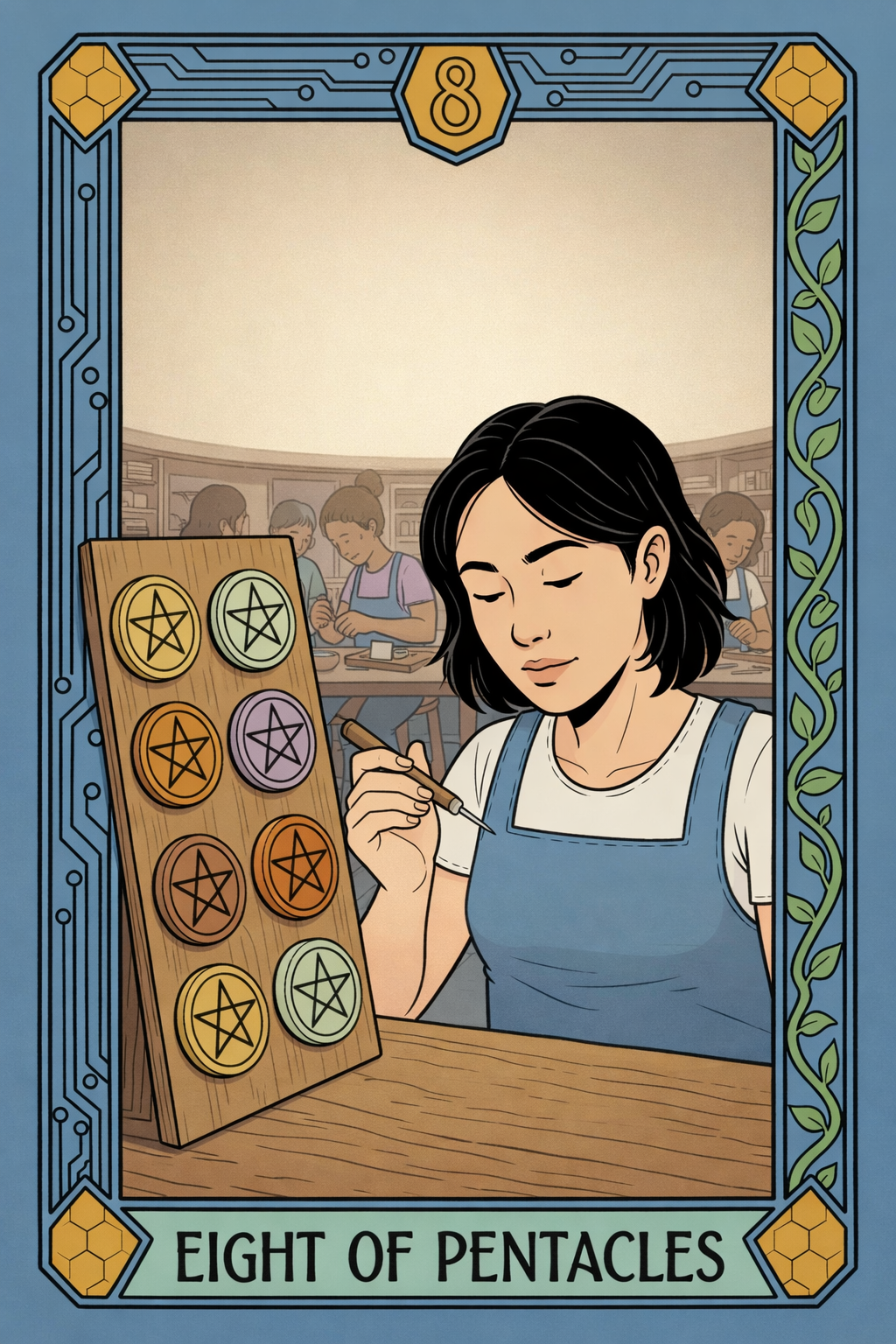 The Eight of Pentacles tarot card represents dedication, skill development, and the pursuit of mastery through focused effort. Traditionally depicted as a figure carefully working on each pentacle, this card reflects patience, discipline, and a commitment to improving over time. When the Eight of Pentacles appears upright in a tarot reading, it suggests that you are fully engaged in developing your craft or working toward a goal. This is a period of learning, refining, and putting in the necessary effort to grow. This card emphasizes that meaningful progress comes from consistency. Small, repeated actions build into something significant. In a Solarpunk interpretation, the Eight of Pentacles reflects intentional creation β people building sustainable systems, crafting solutions, and dedicating themselves to a better future. It represents the idea that progress is built through care, skill, and long-term commitment.