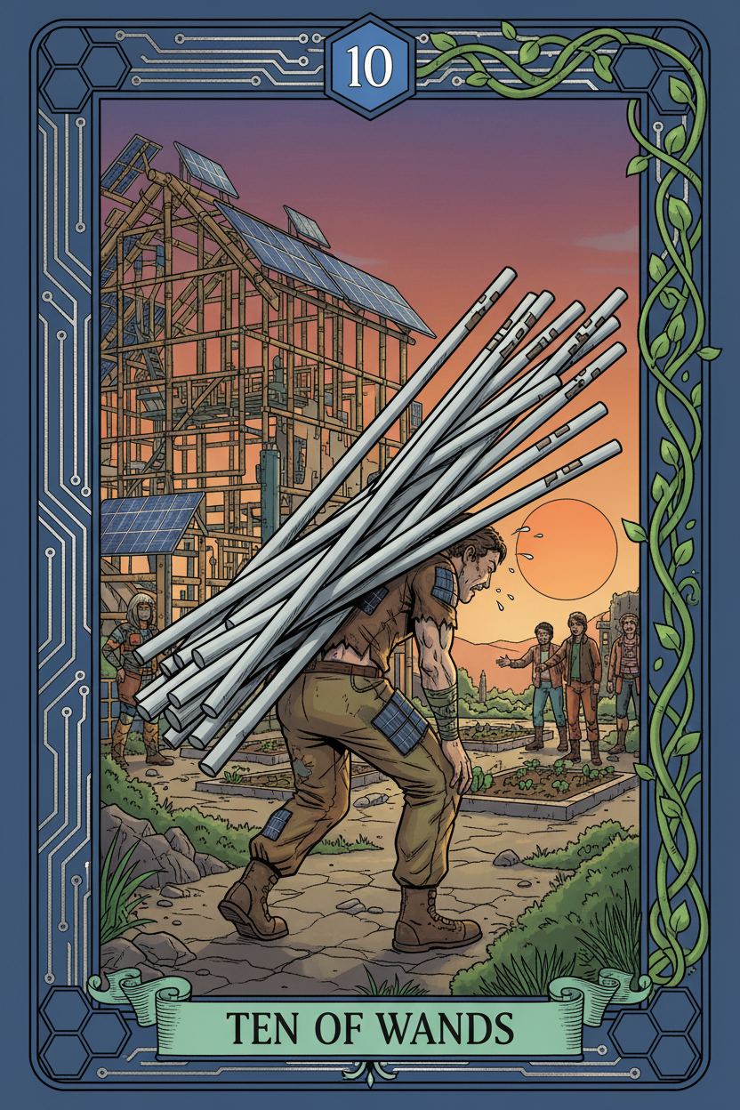 The Ten of Wands tarot card represents responsibility, burden, and the weight of carrying too much at once. Traditionally depicted as a figure struggling to carry a bundle of wands, this card reflects the pressure that comes from taking on more than can comfortably be managed. When the Ten of Wands appears upright in a tarot reading, it suggests that you may be feeling overwhelmed by obligations, expectations, or workload. You have taken on a lot β perhaps willingly β but it is now becoming difficult to sustain. This card often appears when you are close to completing something, but the final stretch feels heavy. In a Solarpunk interpretation, the Ten of Wands represents imbalance in effort β when even positive progress becomes unsustainable. It highlights the importance of distributing responsibility, creating systems that support people, and avoiding burnout in pursuit of growth.