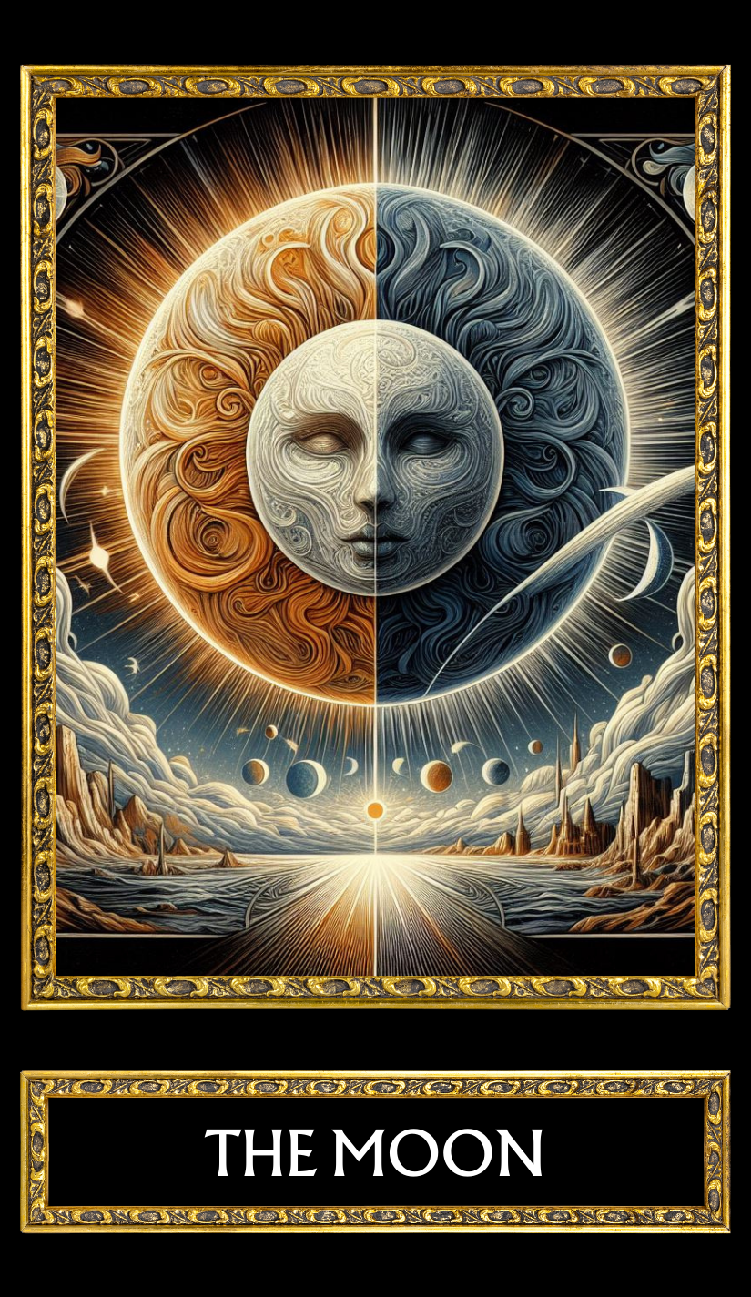 The Moon is the card of the deep subconscious β a realm of dreams, illusions, and things that are not quite what they seem. Numbered XVIII in the Major Arcana, it depicts a full moon hanging between two towers, casting an eerie silver light over a winding path that leads into the unknown. A wolf and a dog howl at the moon from opposite sides β the wild and the domesticated, the instinctive and the rational β while a crayfish emerges from the water below, representing the earliest stirrings of consciousness rising from the depths. When The Moon appears upright, it signals a period of heightened intuition and heightened uncertainty in equal measure. Not everything is as it appears. There may be hidden information, unspoken fears, or subconscious patterns influencing the situation more than you realise. This is not the time for rational analysis alone β pay close attention to your dreams, your gut feelings, and what reveals itself in the quiet between thoughts. Trust your inner knowing even when the path ahead is unclear.