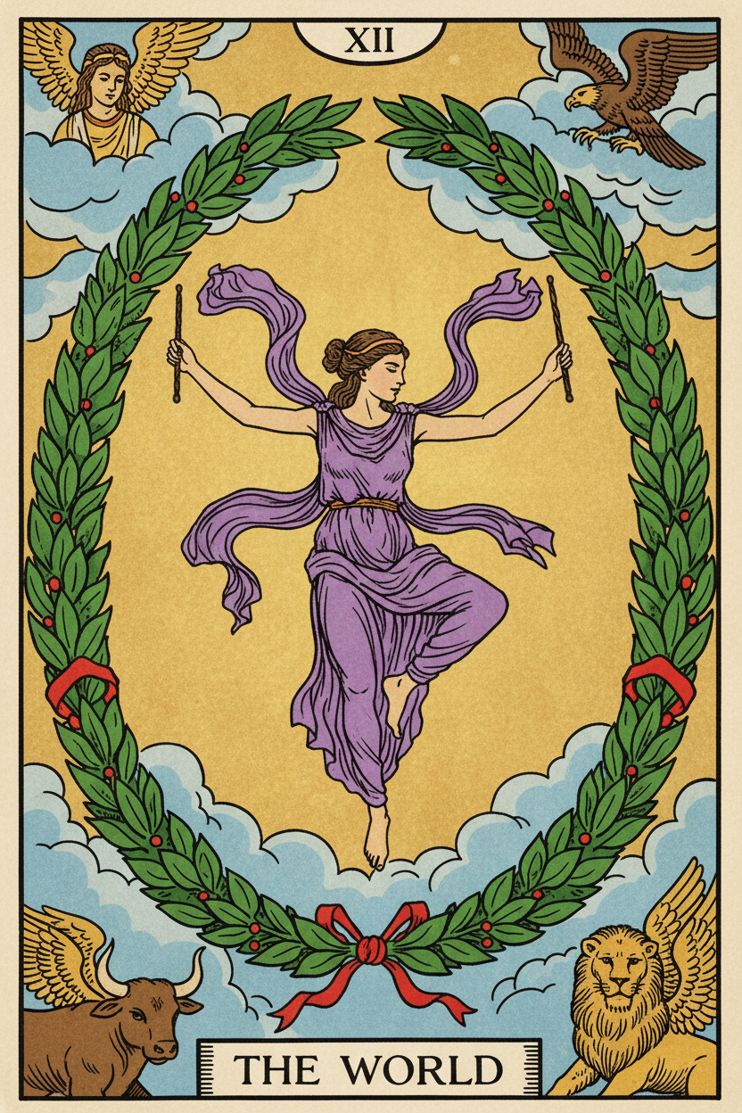 The World tarot card represents completion, fulfillment, and the successful end of a journey. Traditionally depicted as a figure surrounded by a wreath, this card symbolizes wholeness, achievement, and reaching a significant milestone. When the World appears upright in a tarot reading, it signals that you have come full circle. A cycle is completing, and you are stepping into a phase of accomplishment and understanding. This card reflects not just external success, but internal alignment β knowing that you have grown, learned, and reached a meaningful point in your journey. The World is a reminder that effort leads to reward. It marks a moment where everything comes together and you can fully step into the results of what you have created.