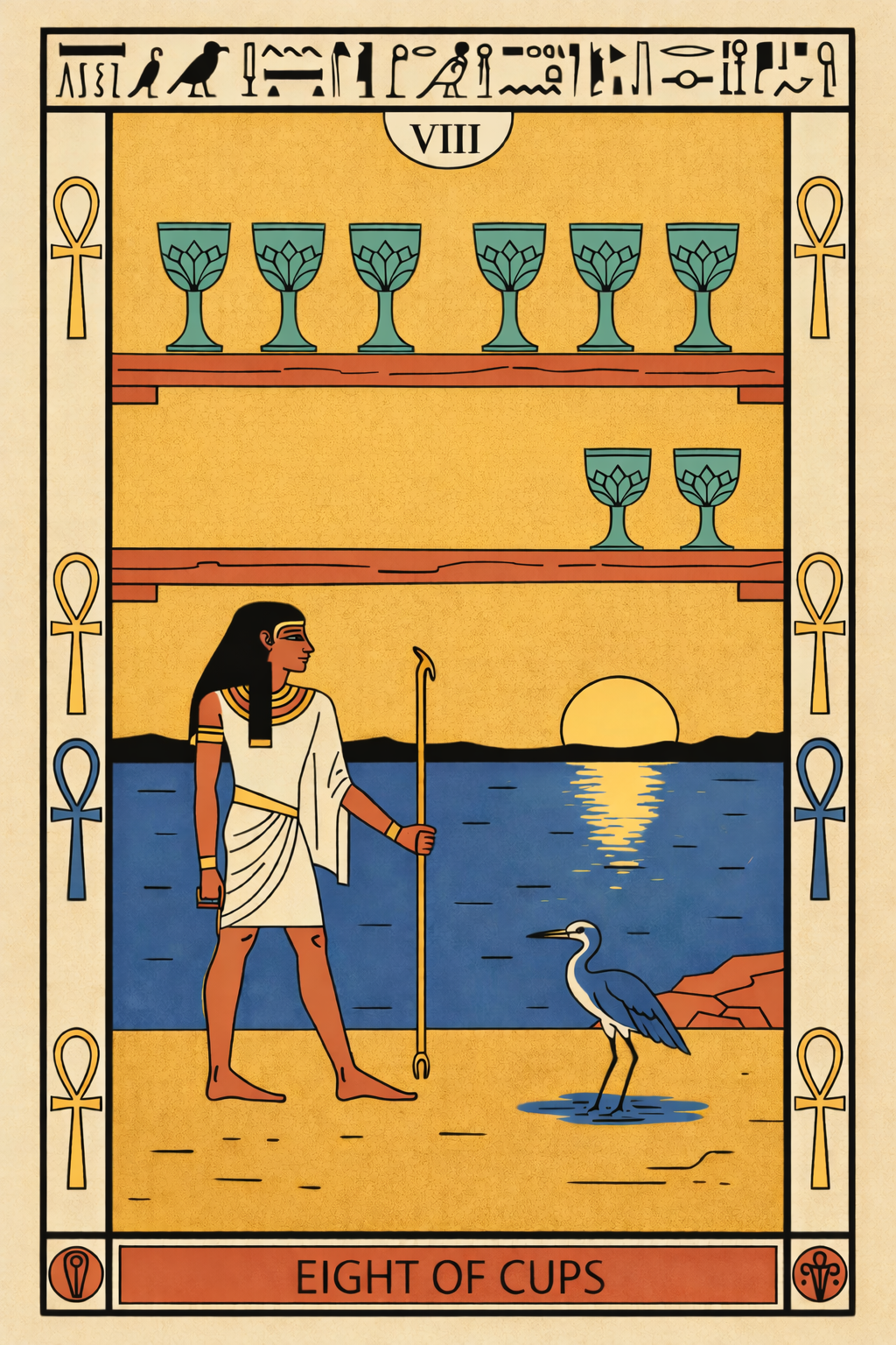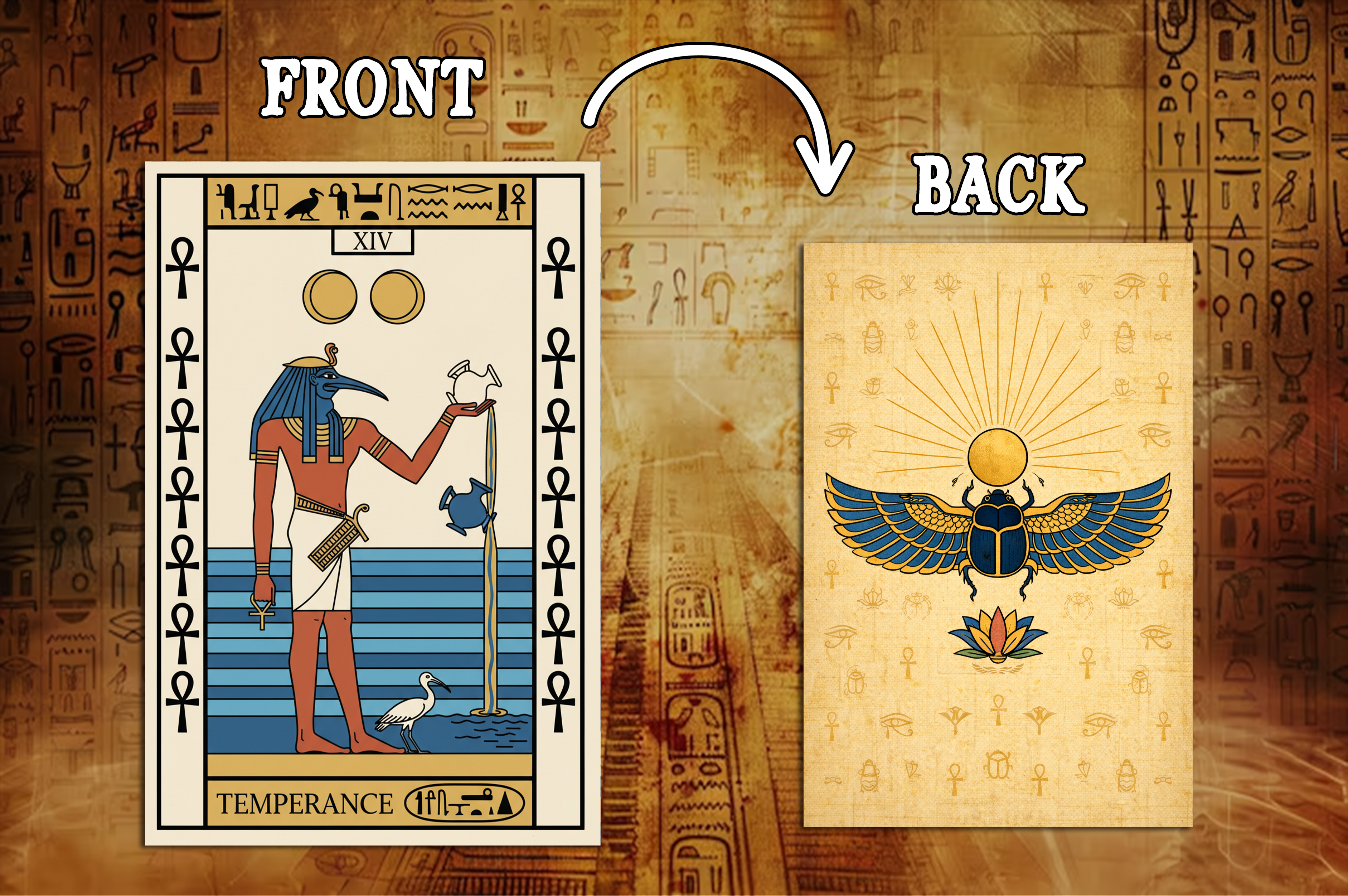 The Amduat Tarot template draws inspiration from ancient Egyptian mythology and the sacred journey of the sun god Ra through the underworld. Using this template you can place your artwork within the engraved Egyptian frame, add the tarot card title and numeral, and export a finished tarot card ready for printing or digital readings.