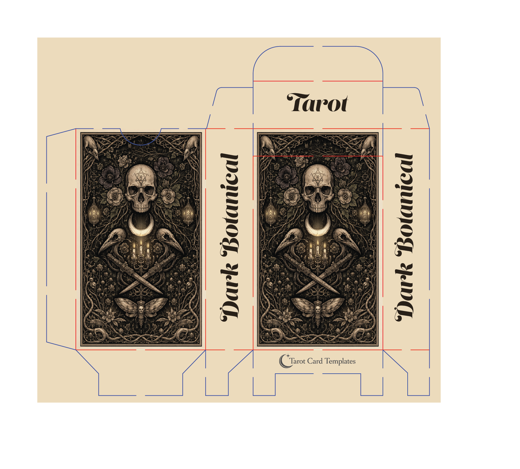 This template is designed for professional tarot card production, including correct dimensions, bleed margins, and high-resolution output. Whether used digitally or printed, the Dark Botanical Tarot Template ensures your deck looks consistent, detailed, and visually striking.