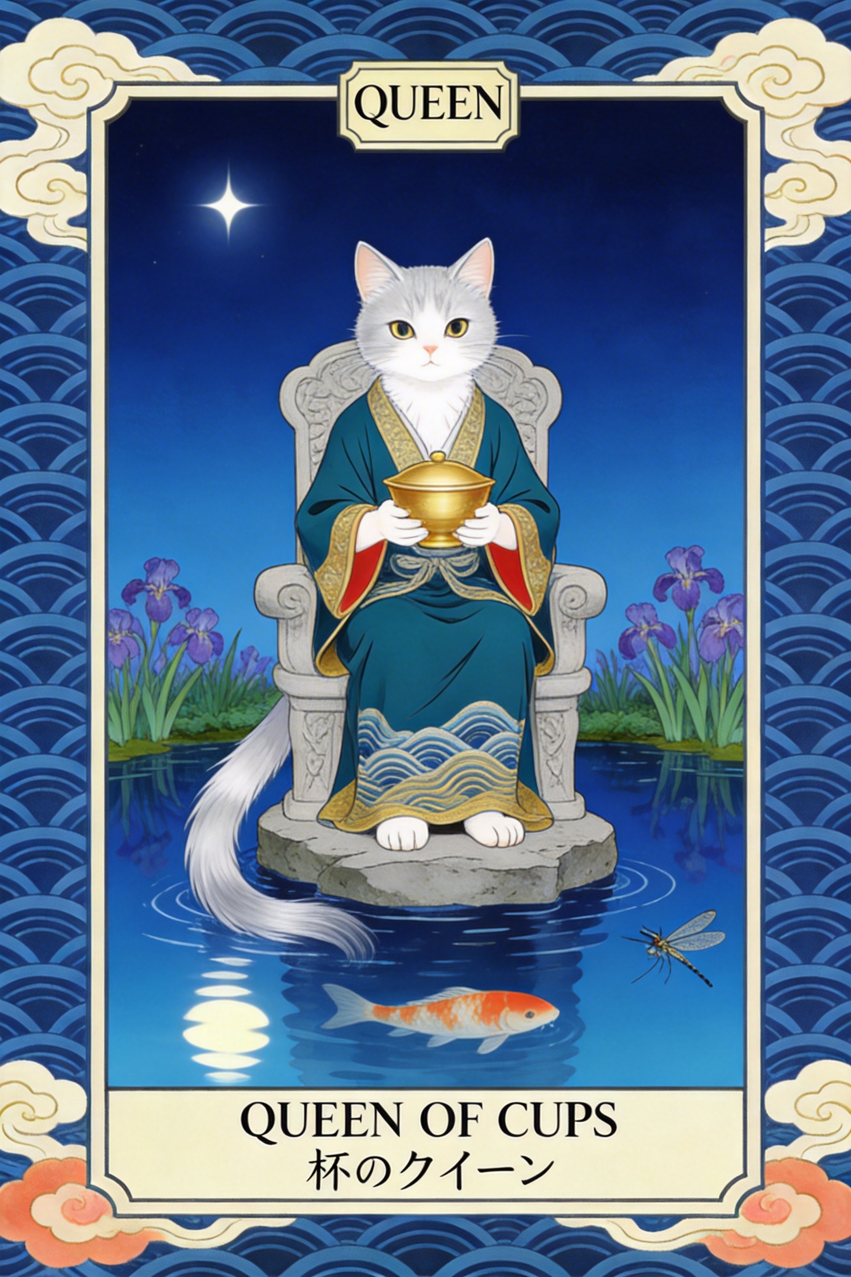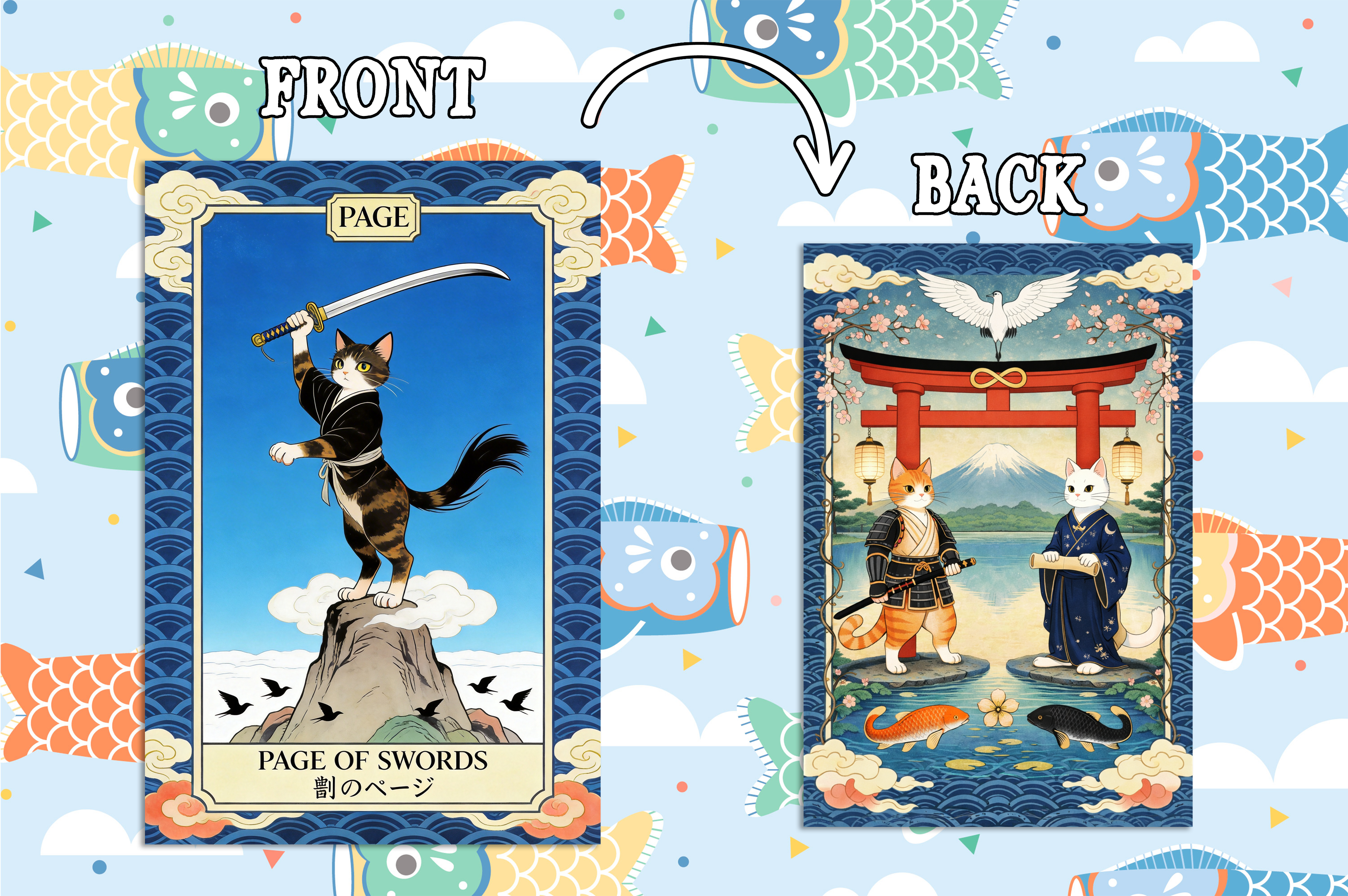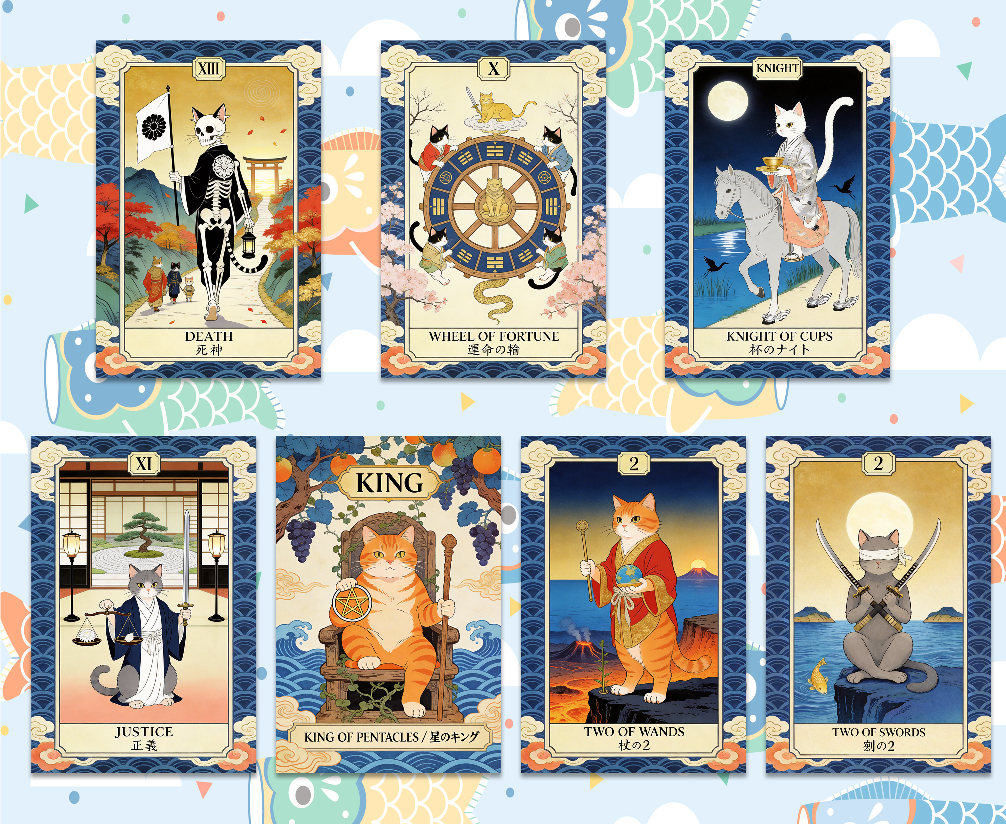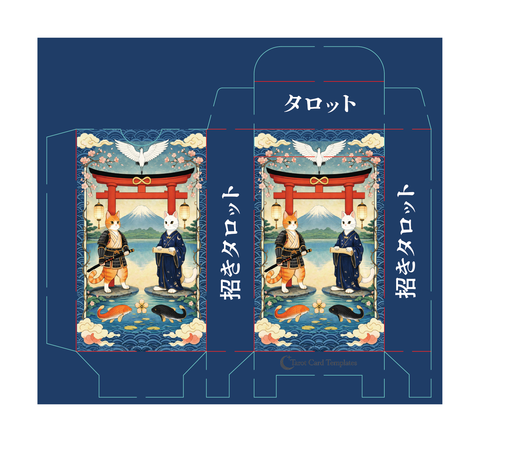 The Maneki tarot template is inspired by Japanese cultural motifs including lucky cats, traditional patterns, and spiritual symbolism. The design creates a tarot deck aesthetic that feels playful, mystical, and culturally inspired.