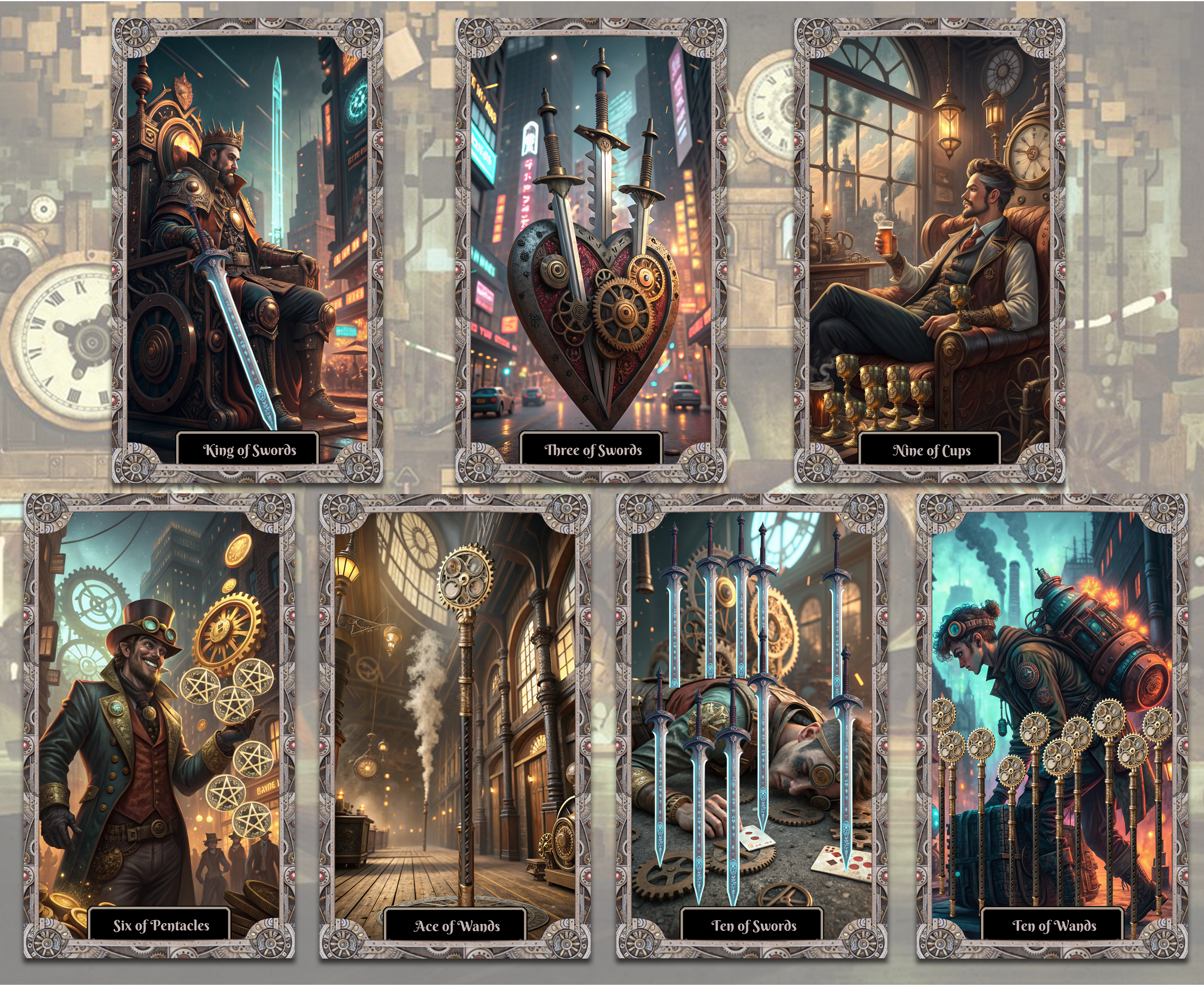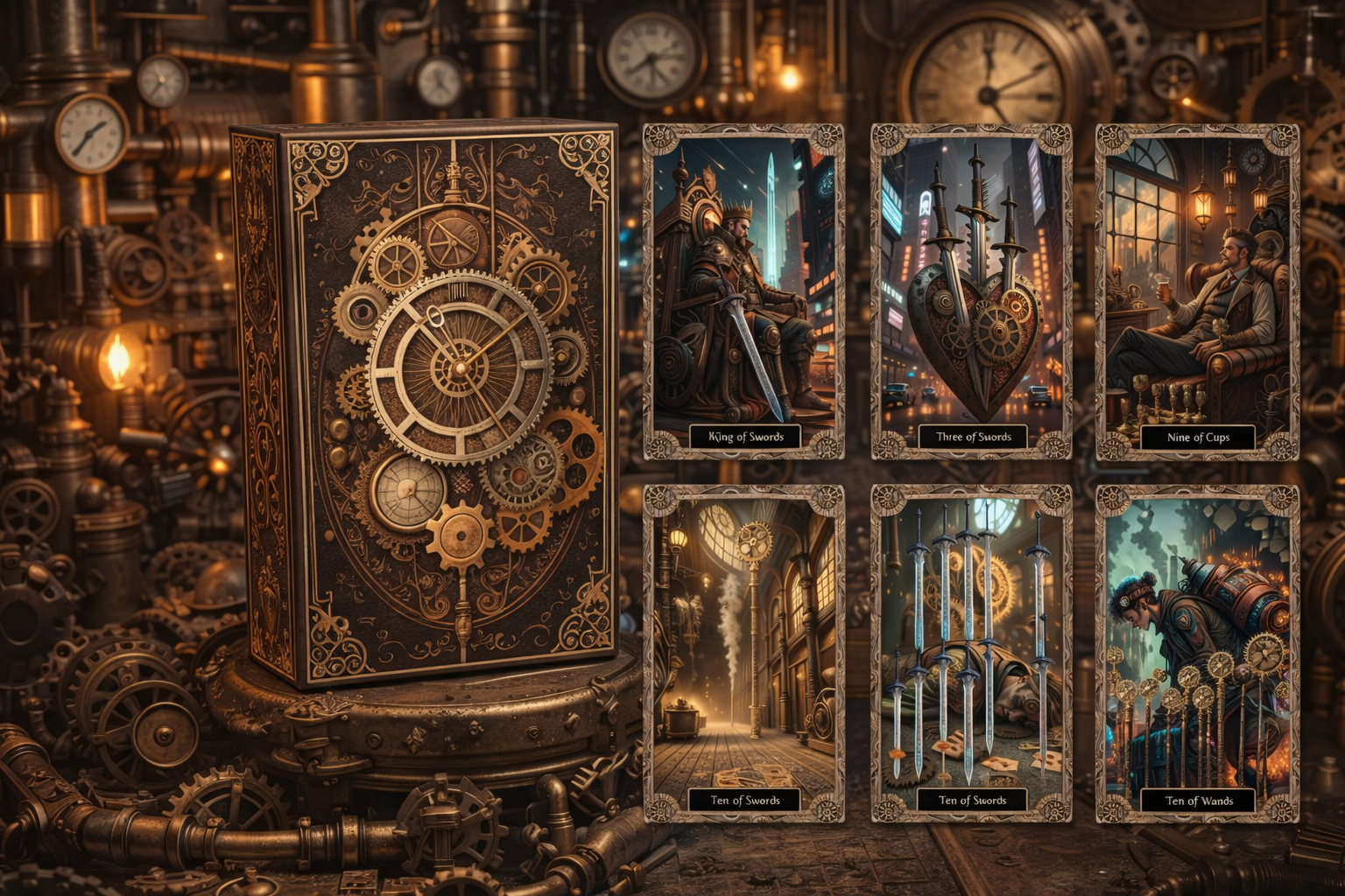 Steampunk works naturally with tarot because both rely on systems and symbolism. The mechanical elements β gears, pressure, motion β enhance core tarot themes like transformation, control, balance, and cause and effect. Cards like The Tower, Death, and Wheel of Fortune feel more grounded and dynamic when interpreted through a mechanical lens. This template doesnβt replace traditional tarot meaning β it strengthens it by giving those meanings a physical, visual language.